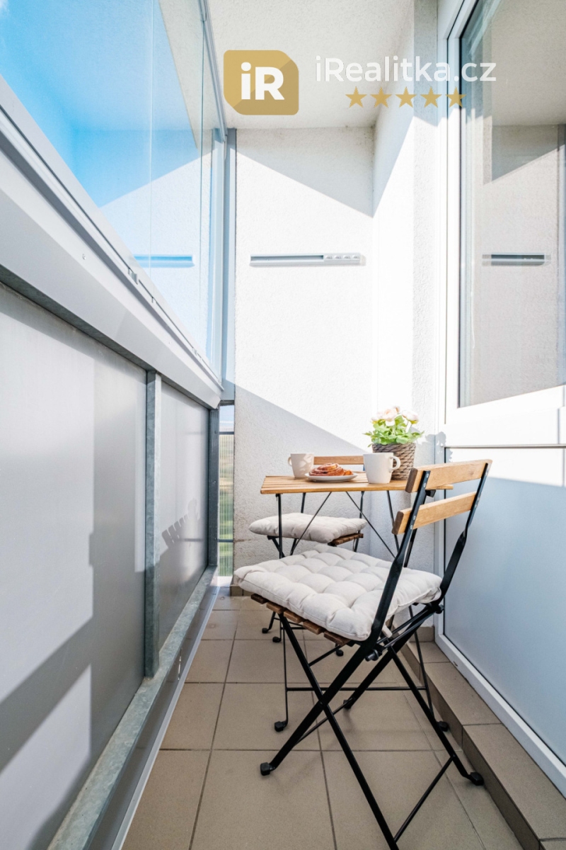 Francouzským oknem pak vstoupíme na zasklenou lodžii (2.8 m²), která vám nabídne krásný výhled a která je stejně jako celý byt orientována na západ. V designové koupelně pak nalezneme umyvadlo, sprchový kout, toaletu a topný žebřík.