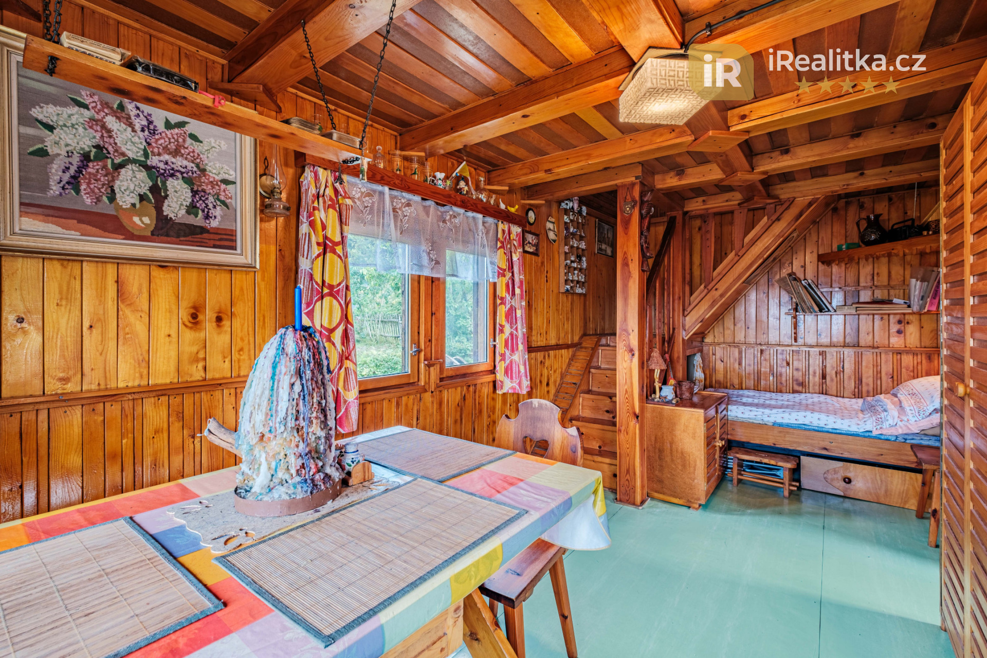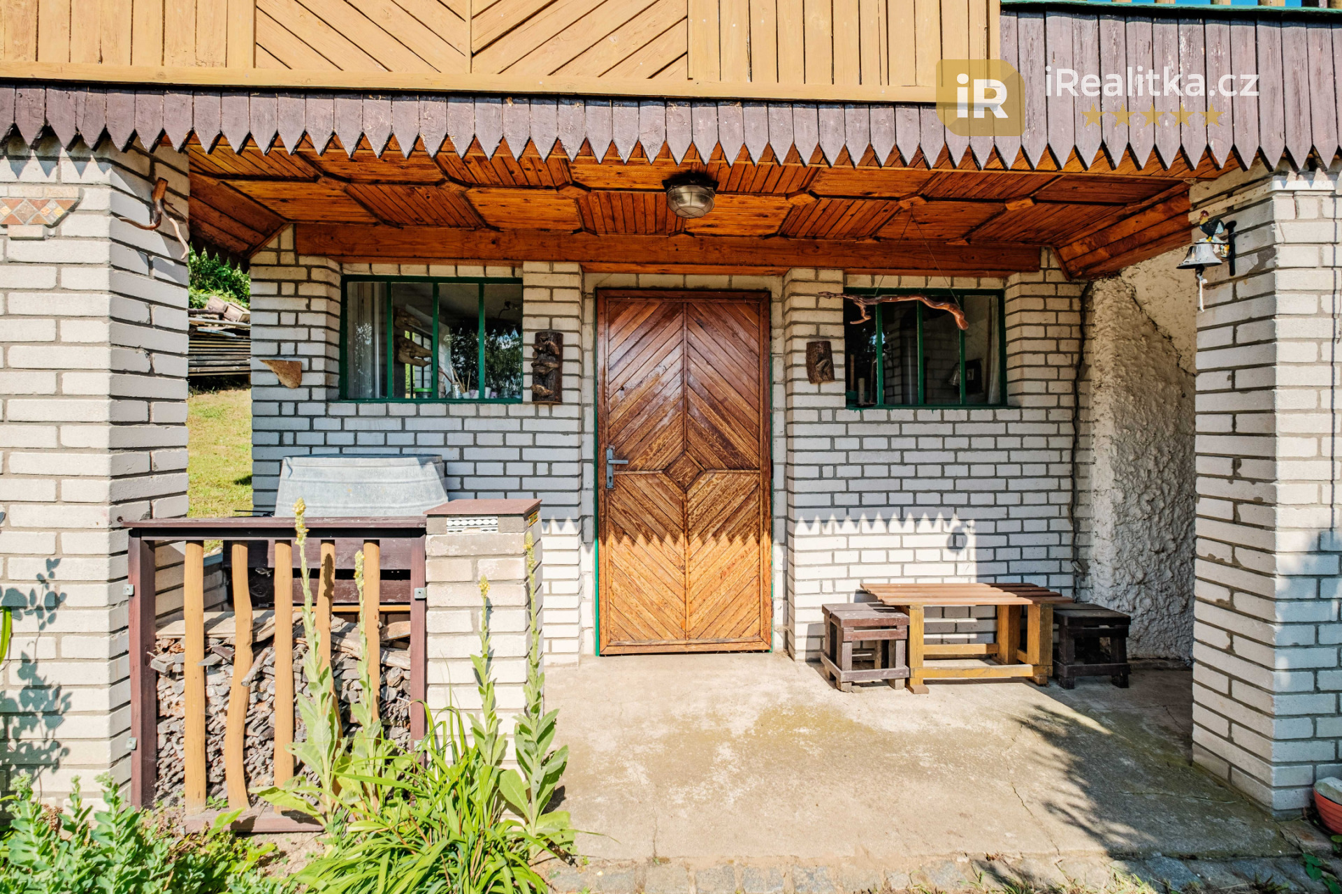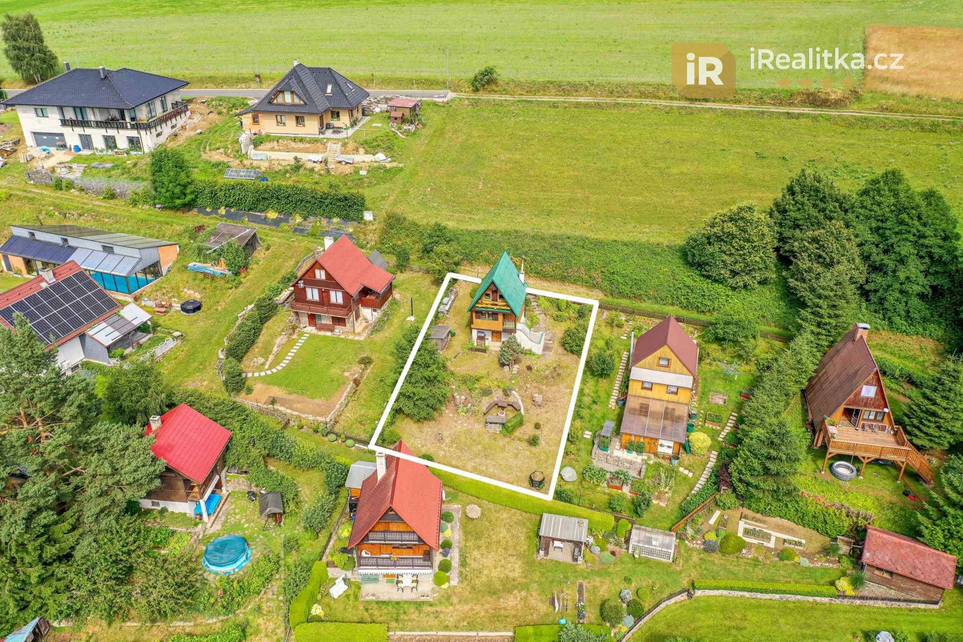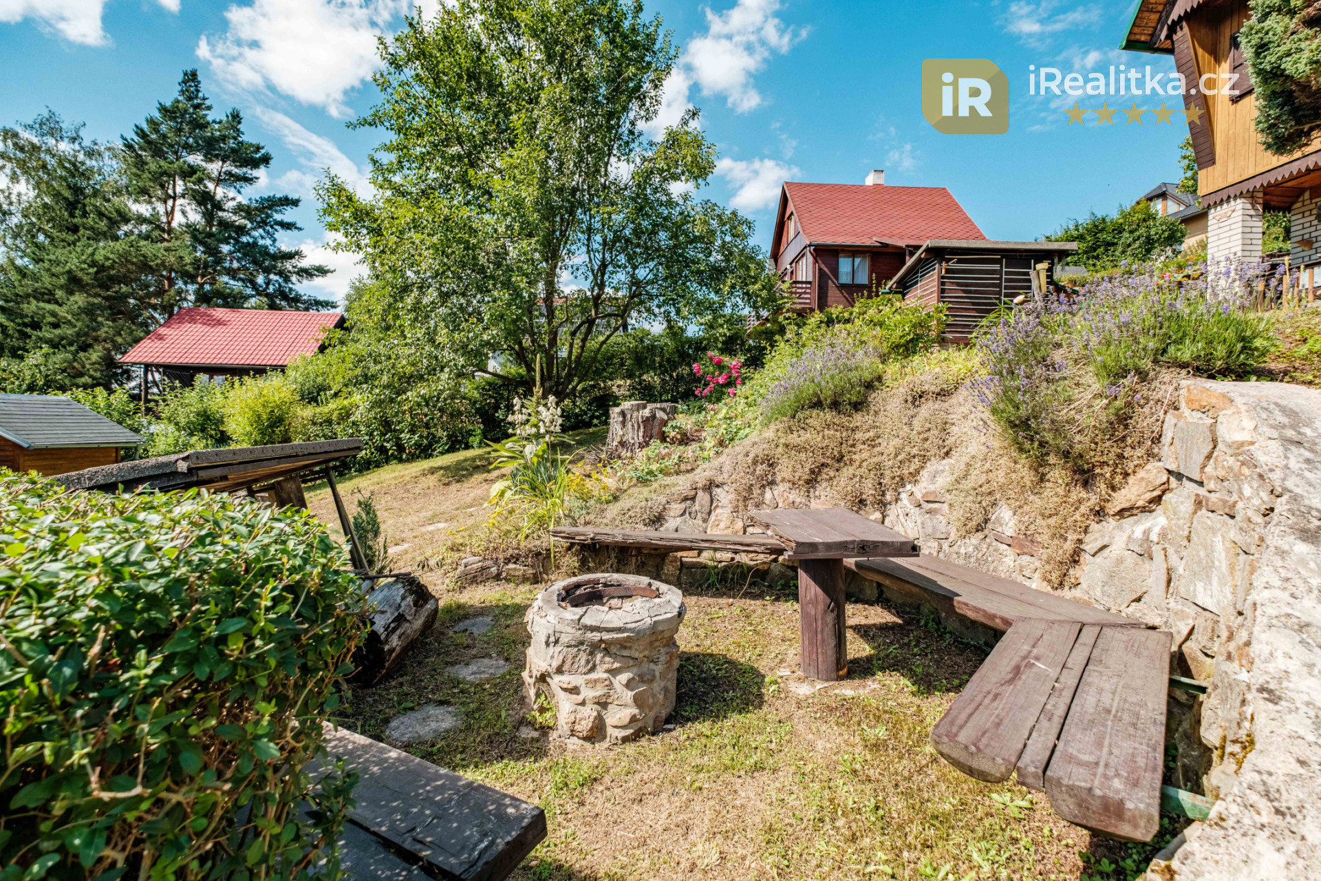 Nemovitost se nachází na svažitém pozemku o celkové výměře 387 m² (z toho zastavěná plocha chaty činí 32 m²) a kromě chaty na něm nalezneme také zahradní domek, posezení s ohništěm, okrasnou zahrádku, stromy a keře.