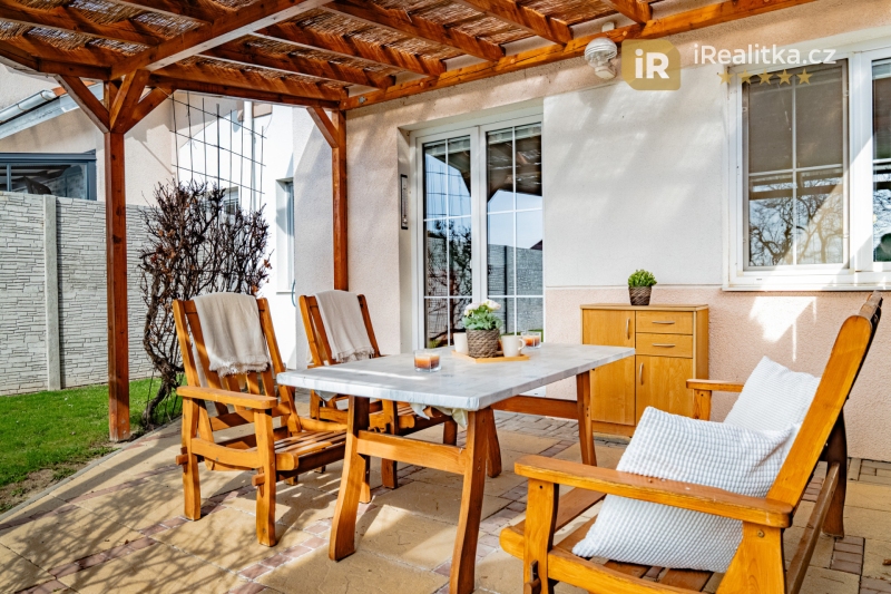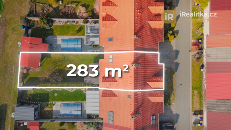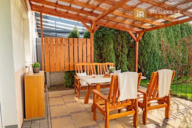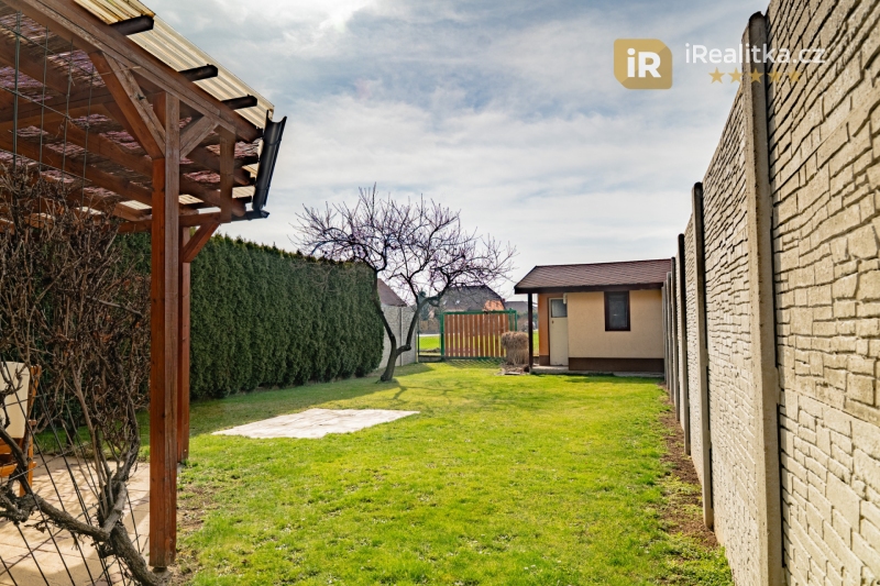 Za domem se pak nachází slunná zahrada s pergolou pro příjemné letní posezení a také zahradní domek vhodný k uskladnění zahradního nářadí a techniky. Celková plocha prodávaného pozemku má výměru 283 m².