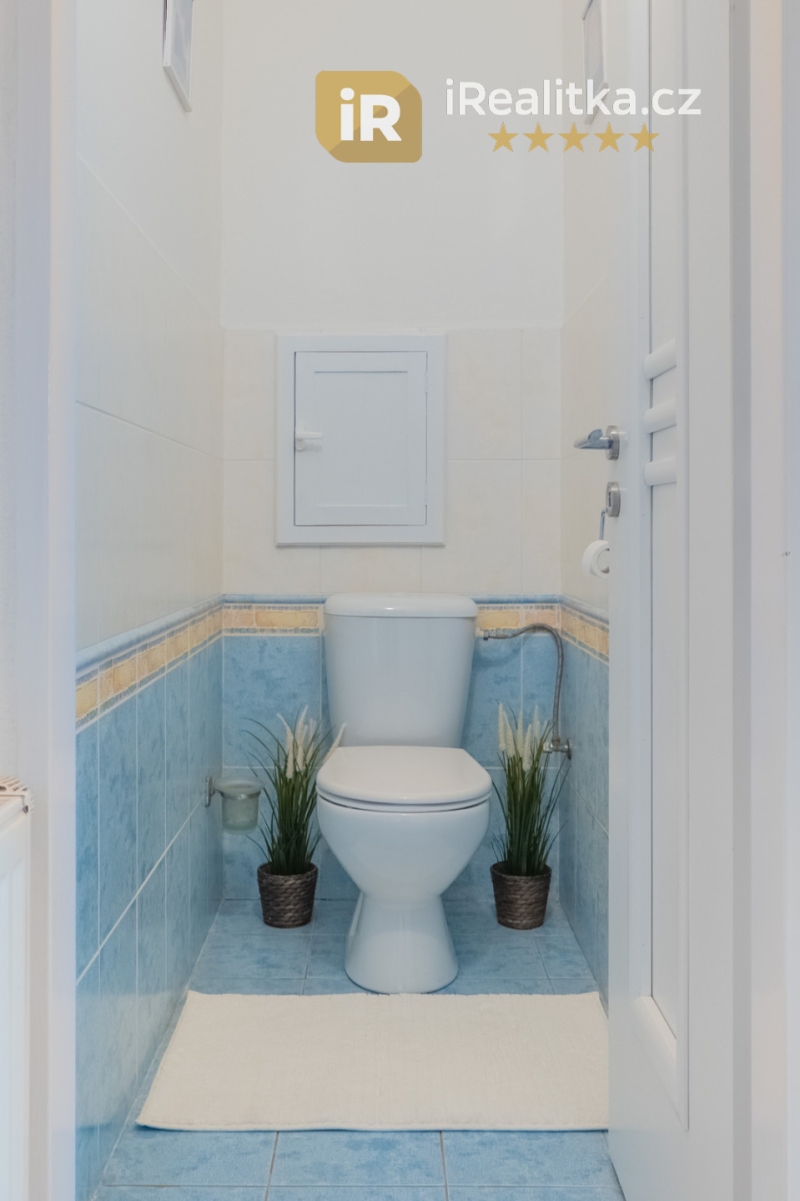 Dále v přízemí nalezneme ještě pracovnu, koupelnu s vanou a umyvadlem, a také samostatnou toaletu.