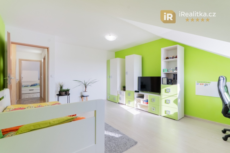 V patře jsou potom situovány další tři pokoje, a to ložnice a dva dětské pokoje. Bude Vám zde k dispozici také ještě jedna místnost, vhodná nejen jako prostorné úložiště, ale také například jako praktická šatna. Sociální zázemí pak tvoří prostorná koupelna se sprchovým koutem, toaletou, dvoj-umyvadlem a také dostatkem místa pro pračku a sušičku.