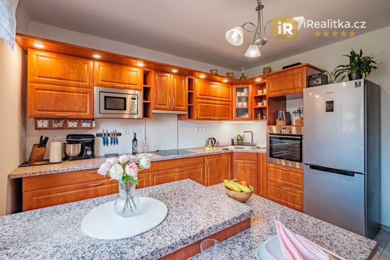 Jedná se o pečlivě udržovaný, zděný rodinný dům, v jehož zvýšeném přízemí nalezneme obývací pokoj s klimatizací, prostornou kuchyň na míru, ložnici s velkou vestavěnou skříní, koupelnu s masážní vanou a sprchovým boxem a toaletou, chodbu, předsíň s další vestavěnou skříní a zádveří. Dispozice přízemí: 2+1 (79 m²).