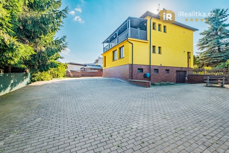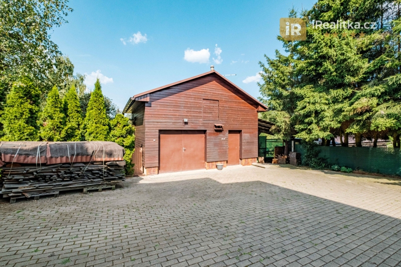 Vedle domu je vybudován velký dlážděný dvůr, odkud pohodlně autem zajedete jak do suterénu, tak i do velkého, zděného zahradního domu (26 m²). Zde pak nalezneme další garáž, skladovací prostor, udírnu a v patře ještě seník.