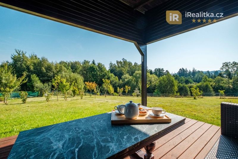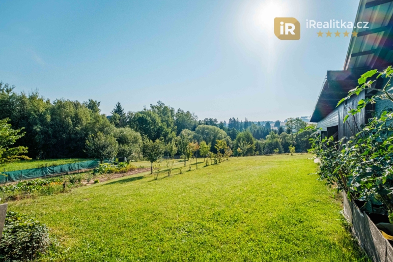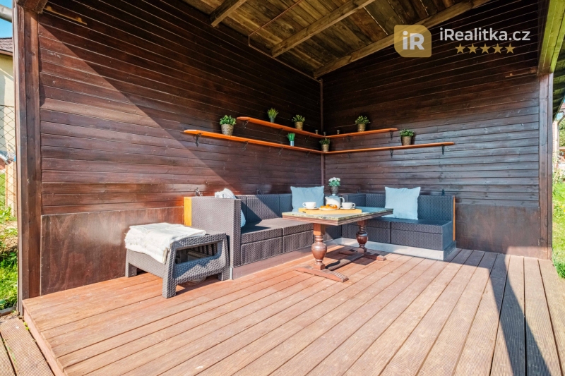 Za zahradním domem se rozléhá velká, mírně svažitá zahrada, na které nalezneme další rozsáhlé prostory pro využití – celkem 4 přístřešky, skleník a především pak pergolu (11 m²) s krásným posezením v klidu a soukromí. Druhá část zahrady je pak více svažitá. Celková výměra prodávaného pozemku činí velkorysých 3.035 m².